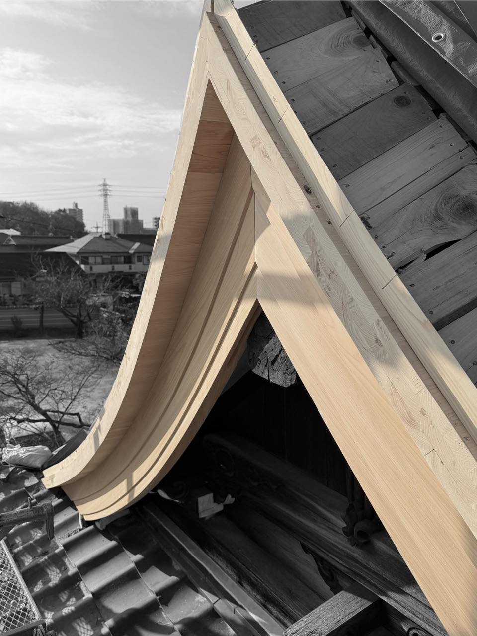 現在は、瓦葺きおよび雀口塗りの工程段取りを進めつつ、懸魚の彫刻作業を再開します