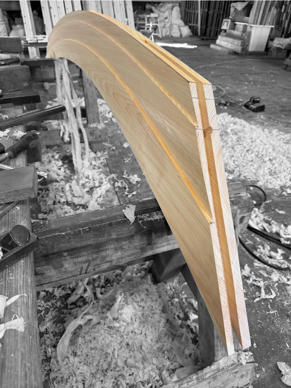 破風板ならびに登り裏甲の取替え工事に先立ち、既存破風板を丁寧に取り外し