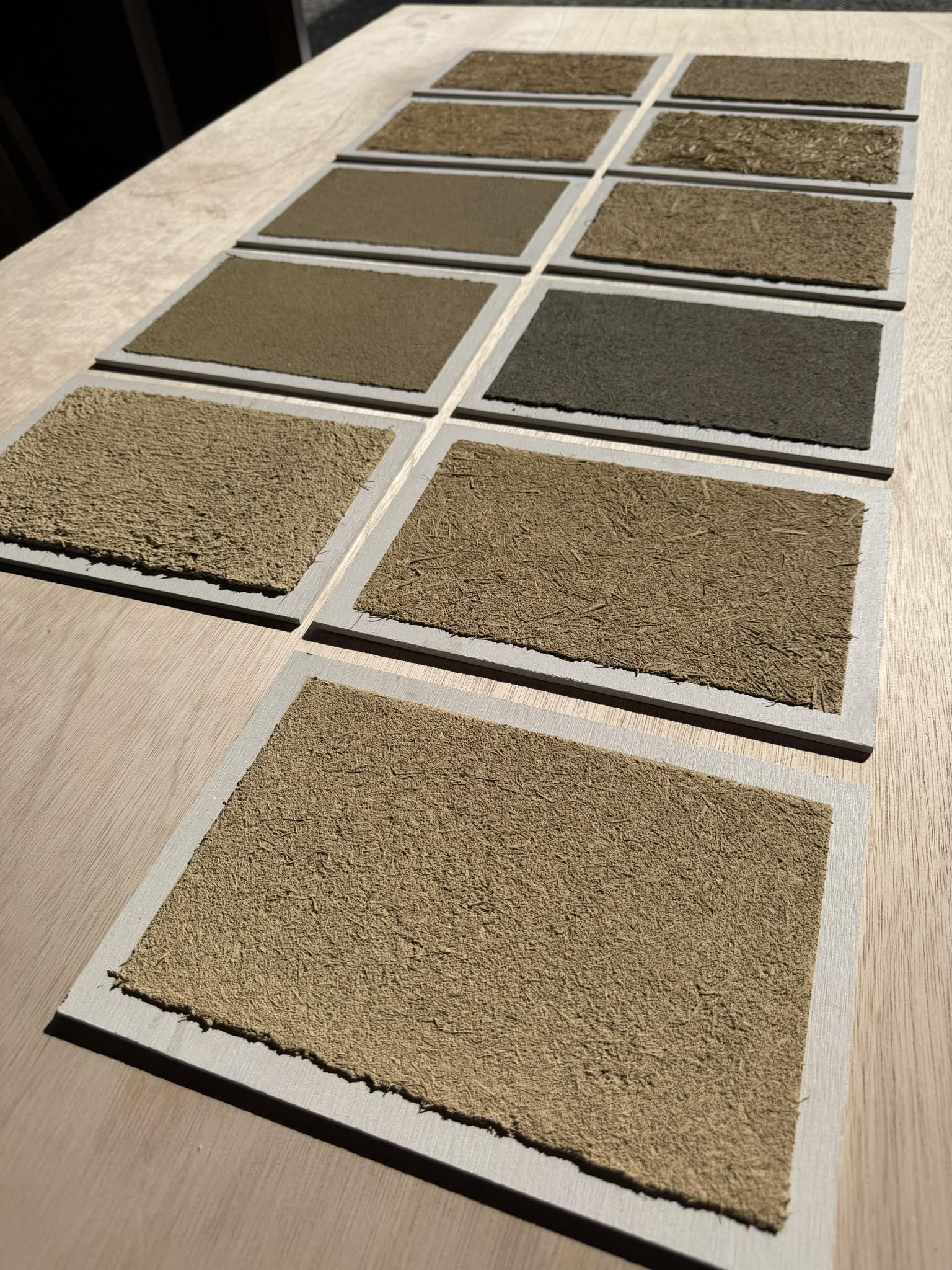 2月には、建築主が打合せのため来日される予定に合わせて、左官壁の仕上げ候補となるサンプルを準備しています