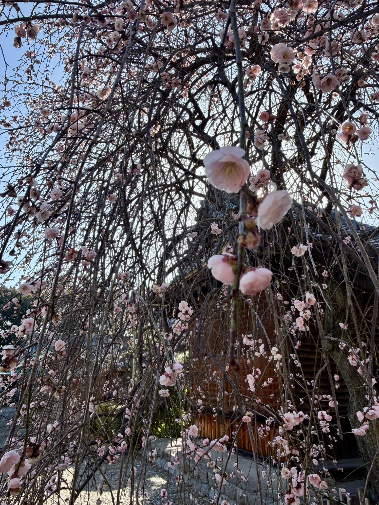 拝殿の左手には、大きな枝垂れ梅が佇み、ちょうど見頃を迎え、見事な花を咲かせておりました