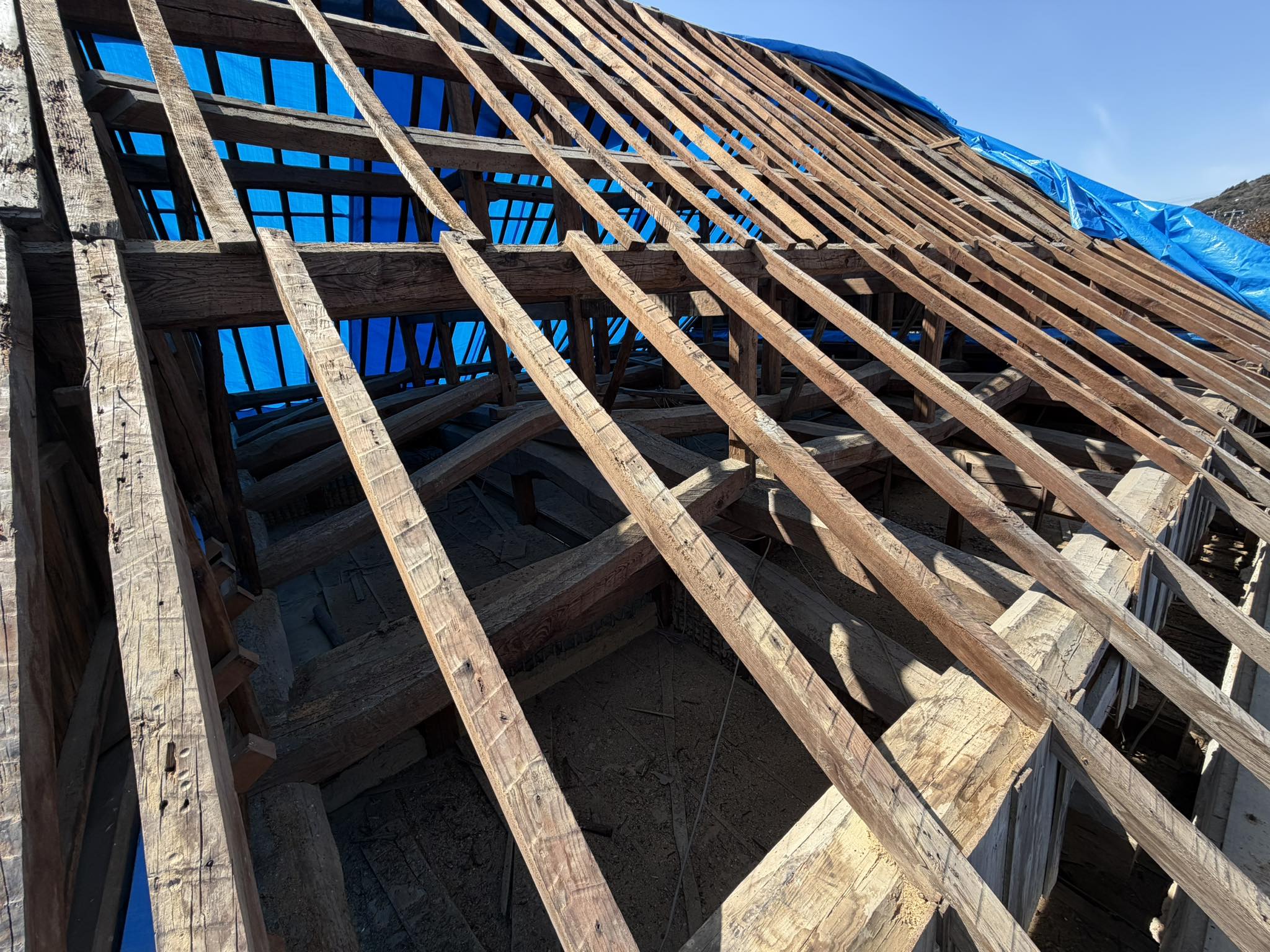 現在、瓦および野地板の撤去は完了し、大工による屋根下地の施工へと移りました