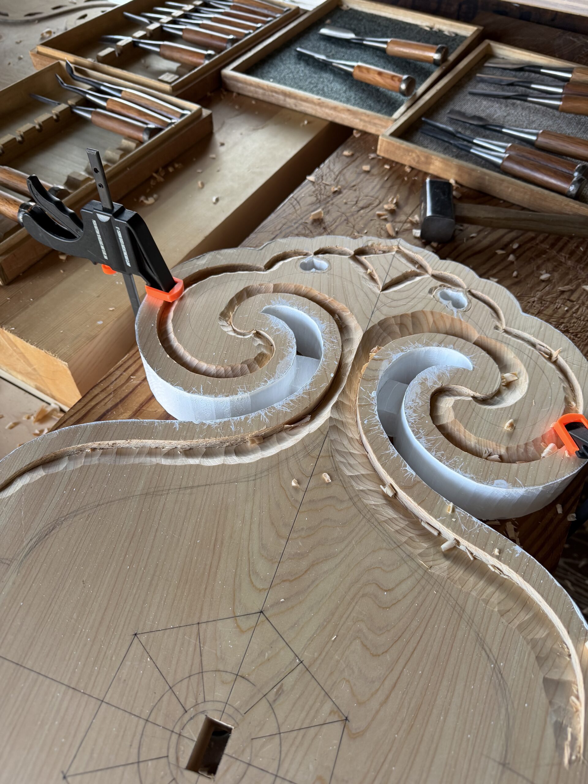 最終の納まりと陰影を見据えながら、現在は荒彫りの工